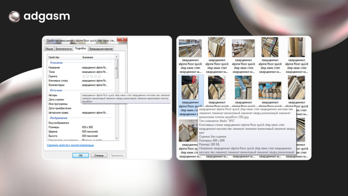Мы добавили ключи в название каждого файла фотографий и во все поля значений в «свойствах» на компьютере. Выбрали ключи, по которым мы не показывались или попадали на низкие позиции.