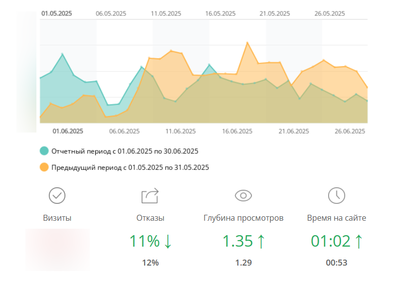 После возобновления активности (июнь 2025): трафик оказался в 1,2 раза выше, чем в период простоя. Рост обеспечили оптимизация старых статей и улучшение шаблона страницы.