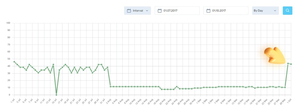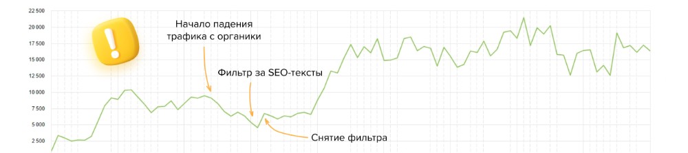 Особенность этого алгоритма в том, что делать ничего не нужно — только ждать. Клиент, конечно, напрягся в этот момент: мы теряем трафик, теряем позиции, давайте что-то делать! Мы отвечали, что это эксперимент Яндекса, и спад в выдаче временный. Наш сайт удобный, хороший, рано или поздно все вернется на свои места. Так и получилось.