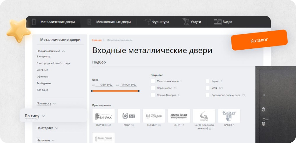 Для каждой категории дверей мы сделали новую страницу. Написали с нуля и оптимизировали каждый текст (фильтр Яндекса сняли). Структура была проработана очень подробно: как межкомнатные, так и входные двери, а также фурнитуру мы разобрали «по косточкам», максимально расширив посадочные под запросы. Каталог позволял удобно выбрать вид двери, тип, цвет, материал, производителя, стоимость — все это показано в боковом меню. Мы внедрили новую структуру и убедились, что покупатели действительно часто ищут двери по назначению — этот пункт в меню оставили по умолчанию раскрытым.