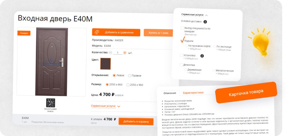 Напомним, что в середине 2017 года мы приступили к работе над новым сайтом. Он изменился коренным образом: на старом сайте можно было посмотреть, какие двери продаются в салонах, выбрать основные параметры для них, но дальше — чтобы заказать доставку, посчитать конечную стоимость с учетом комплектации — нужно было пообщаться с менеджером. Новый сайт стал полноценным интернет-магазином, где все можно было сделать онлайн. Мы взяли за пример начинающие набирать популярность маркетплейсы.