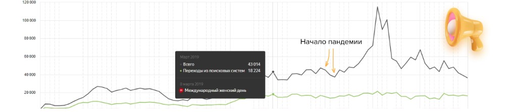 Трафик на сайт заказчика немного упал. В апреле 2020 спрос в интернете по данным wordstat Яндекс по сравнению с апрелем 2019 года уменьшился на 12 357 запросов.