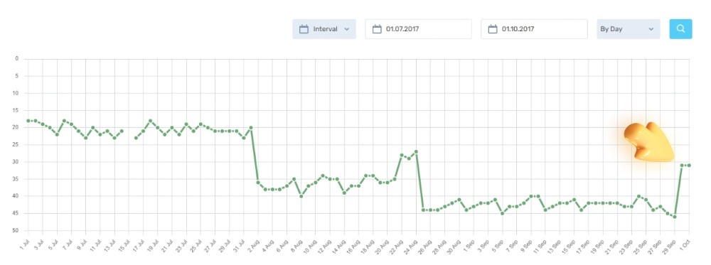 Вот как упала и как выросла после этого средняя позиция сайта (упала с 20 до 35–46, показала рост до 28).