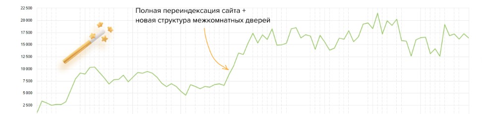 На тот момент это было топовой практикой, «подсмотренной» нами у федеральных гипермаркетов. Мы одними из первых внедрили ее в этой сфере по Санкт-Петербургу. Суть в том, что семантическое ядро мы собирали, отталкиваясь от того, как пользователи ищут информацию, какие запросы могут вбивать в поисковик. В каталоге были входные и межкомнатные двери, но значительная доля посетителей вводила дополнительные, иногда более узкие запросы — например, «купить дверь в ванную комнату».