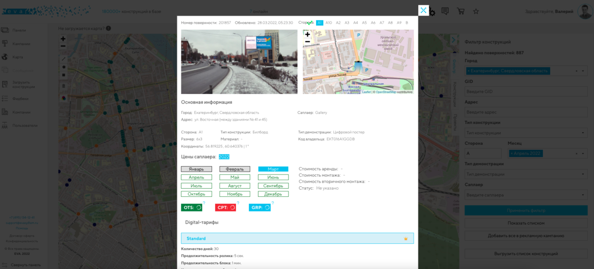 Данные удобно расположены на карте и есть дополнительные возможности отбора и формирования рекламных кампаний. Поверхности оценены и имеют помесячные рейтинги. Считается всё. От сити-форматов до брандмауэров и медиафасадов (про метрики мы еще расскажем в других постах).