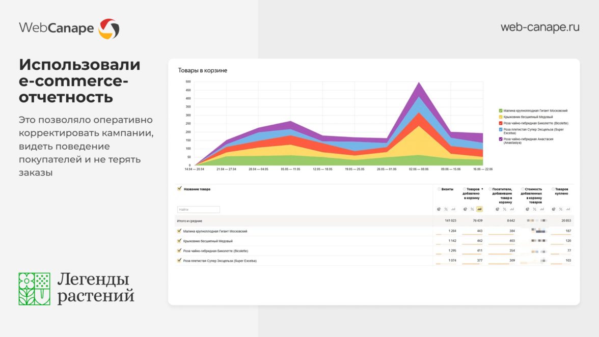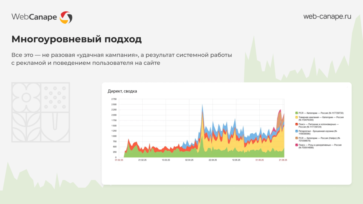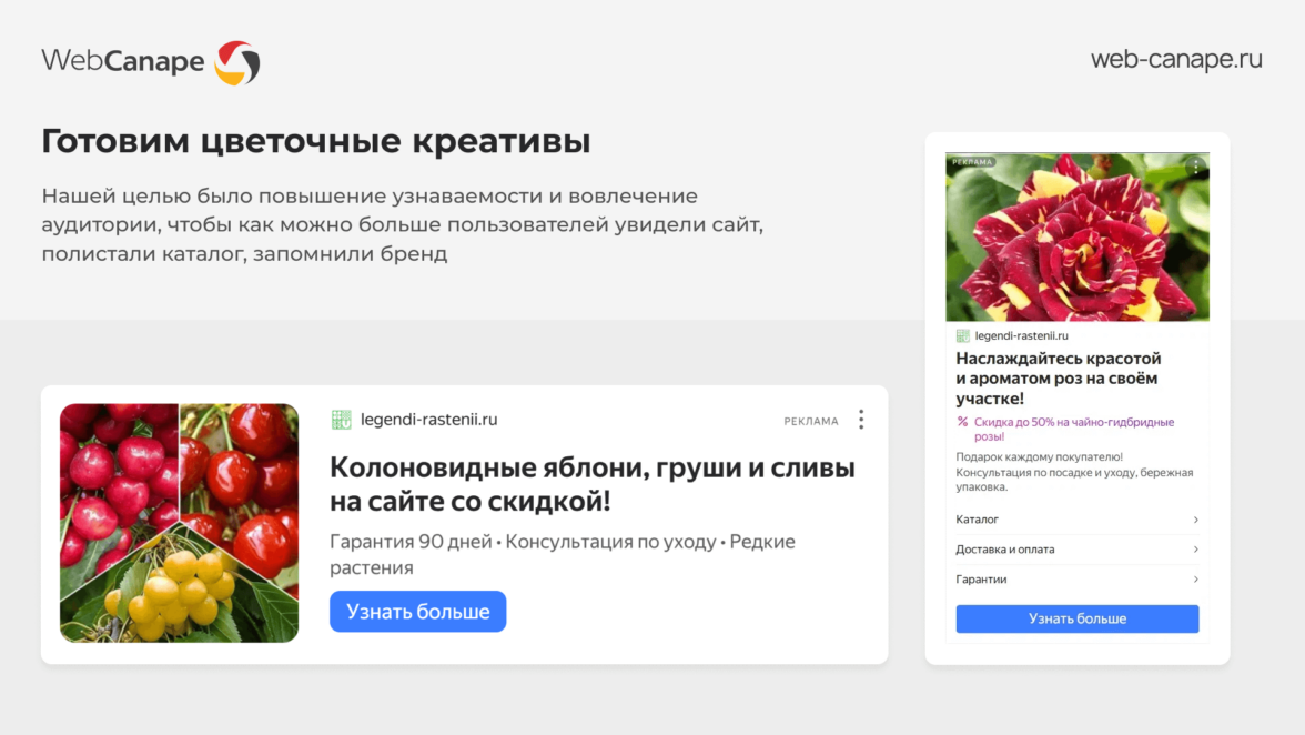 Наш клиент — компания «Легенды растений», специализирующаяся на продаже саженцев и декоративных культур. В 2024 году мы завершили для них разработку нового сайта, и следующим логичным шагом стала рекламная поддержка.