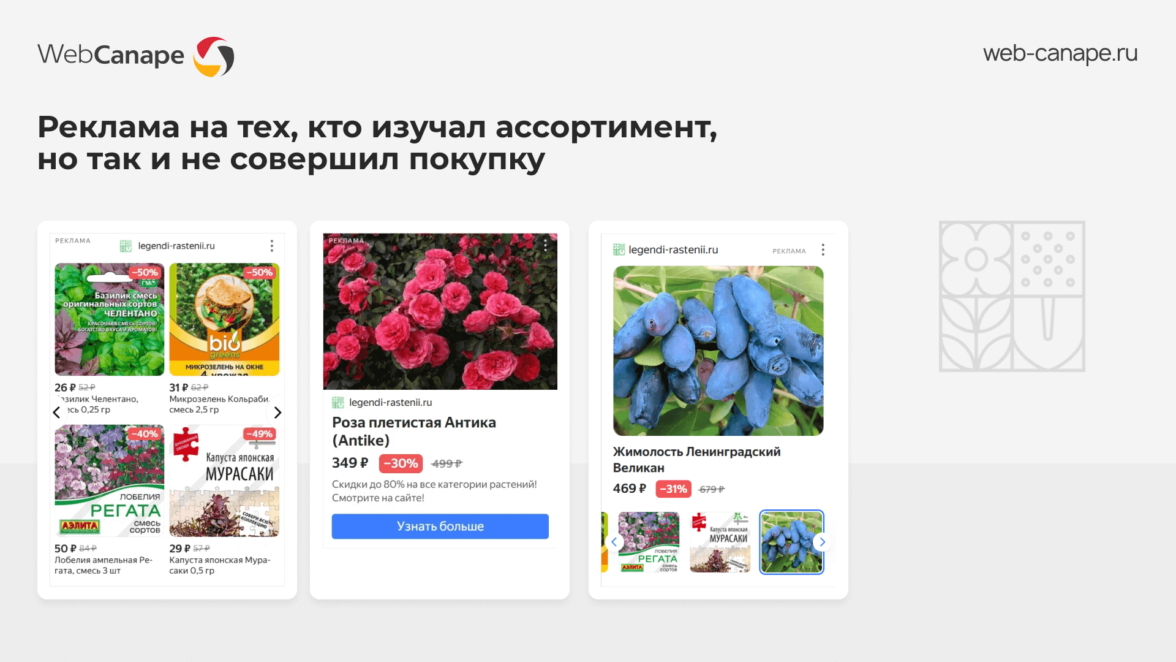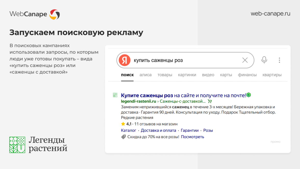 Параллельно мы запустили кампанию в поиске — с фокусом на горячую аудиторию, которая уже ищет конкретные растения для покупки. Это был инструмент точечного захвата спроса и прямых заявок.