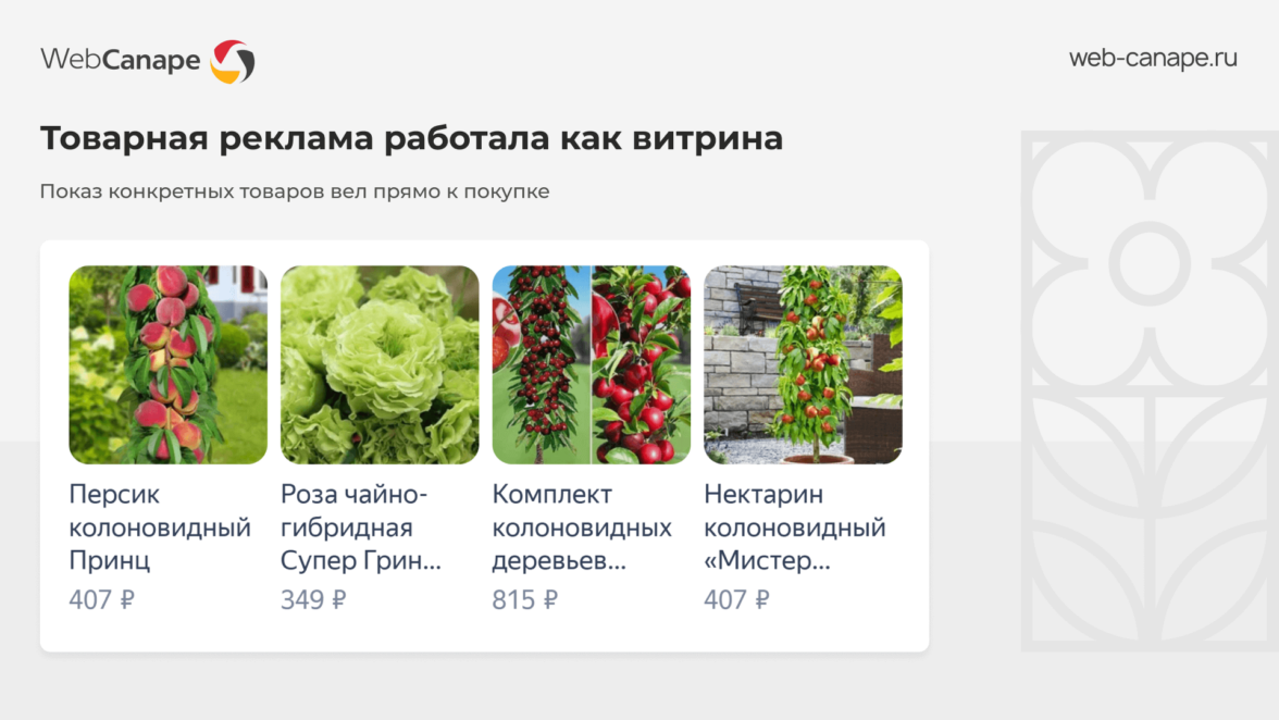 Когда кампании начали давать стабильные заявки и стало понятно, что реклама сайта приносит продажи, мы расширили охват через товарную рекламу. Это формат, при котором в ленте показываются конкретные карточки товаров.