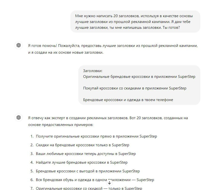 На Поиске мы запускали объявления с иконкой приложения, заголовками и текстами, то есть подготовить нужно было только заголовки и тексты. Мы сделали это в два этапа с помощью нейросети.