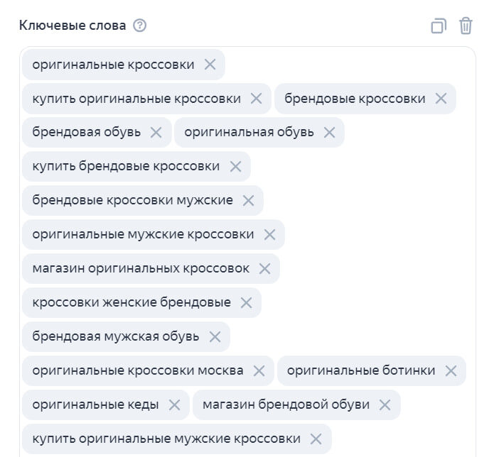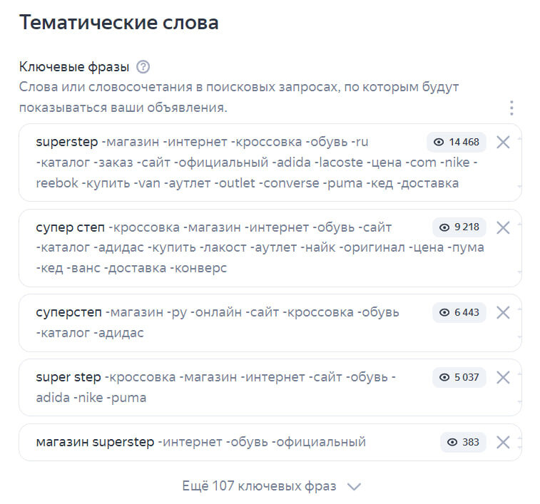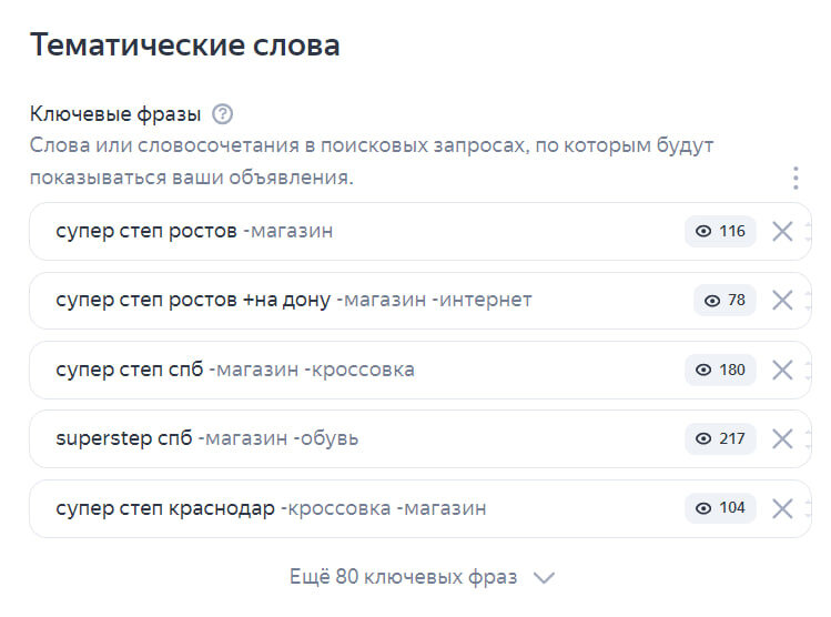 Таргетинг: общие категории запросов и брендовые запросы. Чтобы охватить больше заинтересованной аудитории, позже мы добавили и вендорные ключи — на отдельные бренды, которые есть в ассортименте приложения.