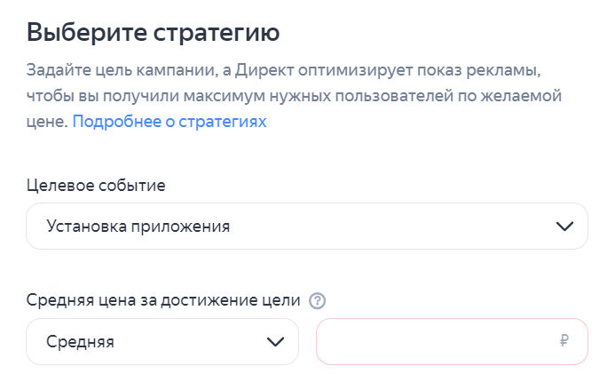 Стратегия ставок: средняя цена за достижение цели (установки). Выбрали такой подход, чтобы охватить больше целевой аудитории и при этом попасть в стоимость In-App событий. Установка приложения — наиболее частотное событие, поэтому кампания смогла быстро собрать необходимое количество данных для обучения.