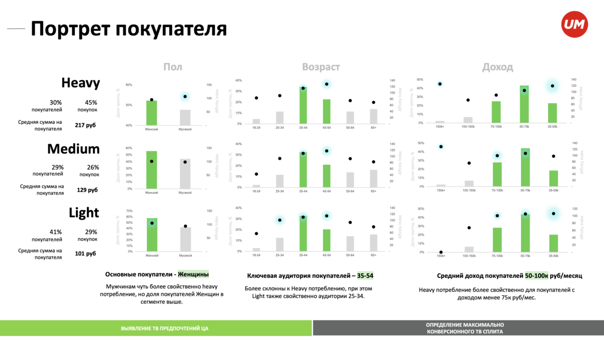 Также такой подход позволяет оптимизировать сплит и сформировать коммуникационное сообщение в зависимости от бизнес-задачи. Например, если необходимо стимулировать к покупкам пользователей из сегмента light, то можно сделать в продвижении акцент именно на нем, использовав нужный сегмент и сформировав правильное коммуникационное сообщение. Если стоит цель переключить сегмент heavy-покупателей с конкурента на ваш продукт, то ТВ-сплит формируется применительно к данному сегменту.