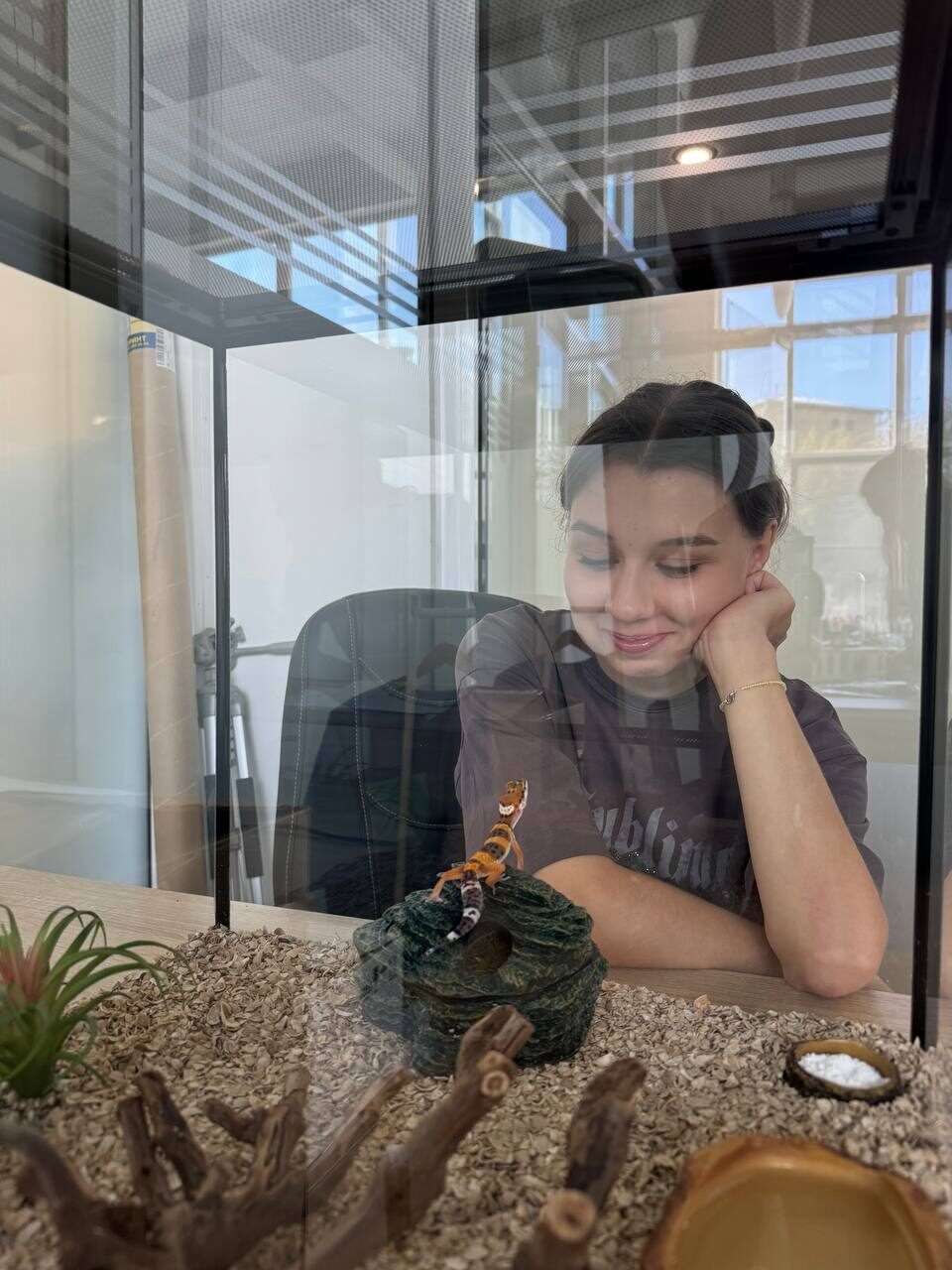 Общий язык с Гектариной мы нашли с первых дней. Коллеги из разных отделов приходили посмотреть на маленького сотрудника, который поселился на рабочем столе HR-отдела. Для него подобрали просторный террариум, создали определенный температурный режим и налажены поставки свежих сверчков на обед. Кормили его всем миром по-очереди. А когда ящерица подросла, мы начали учиться взаимодействовать с ней тактильно: брать на руки, гладить и играть. Но так, чтобы Гектарине было комфортно.