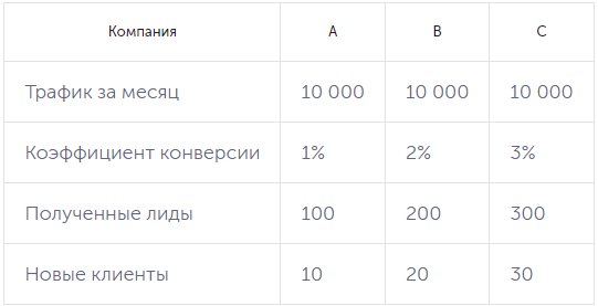 Пример этих формул в действии: если ваш сайт посещают 10 000 посетителей в месяц, которые генерируют 100 лидов и в итоге 10 клиентов каждый месяц, то коэффициент конверсии посетителей сайта в лиды равен 1%.