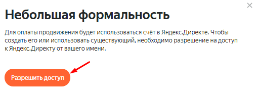 Сразу при переходе в раздел появляется предупреждение о том, что оплата рекламы происходит через счет в Яндекс Директе. Поэтому прежде чем настраивать рекламу, разрешаем доступ к счету: