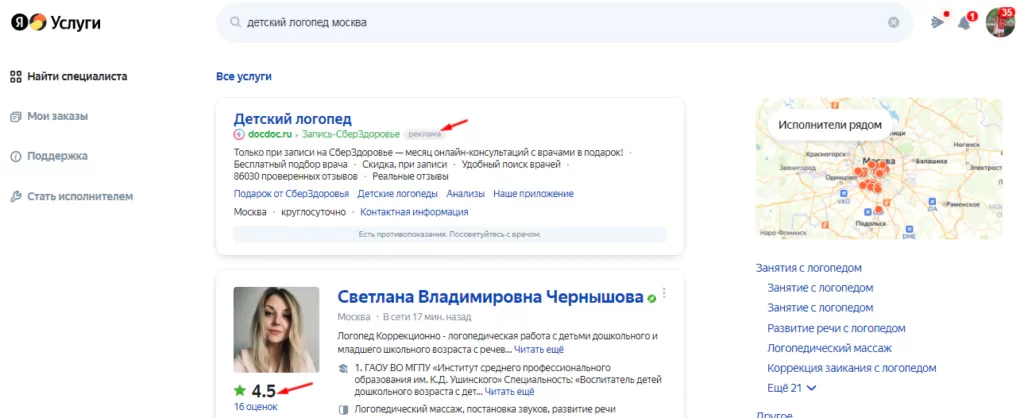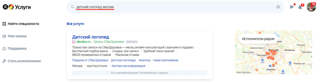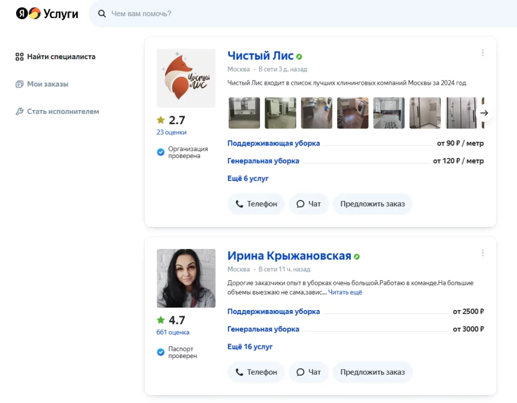 Поиск специалиста на сервисе ничем не отличается от поиска в Яндексе: надо зайти на Яндекс Услуги и ввести запрос в поисковой строке. Дальше остается только выбрать подходящего кандидата. На первых позициях выдачи находится реклама и специалисты с высоким рейтингом.