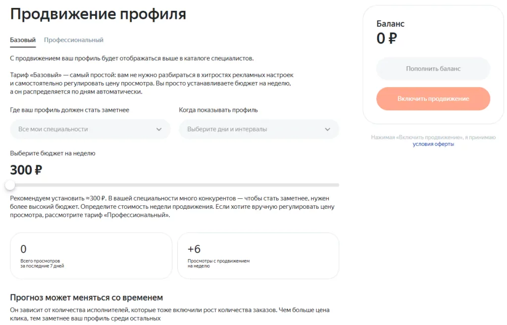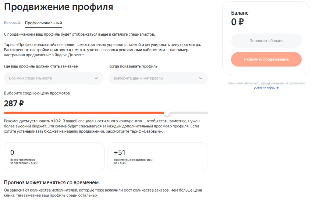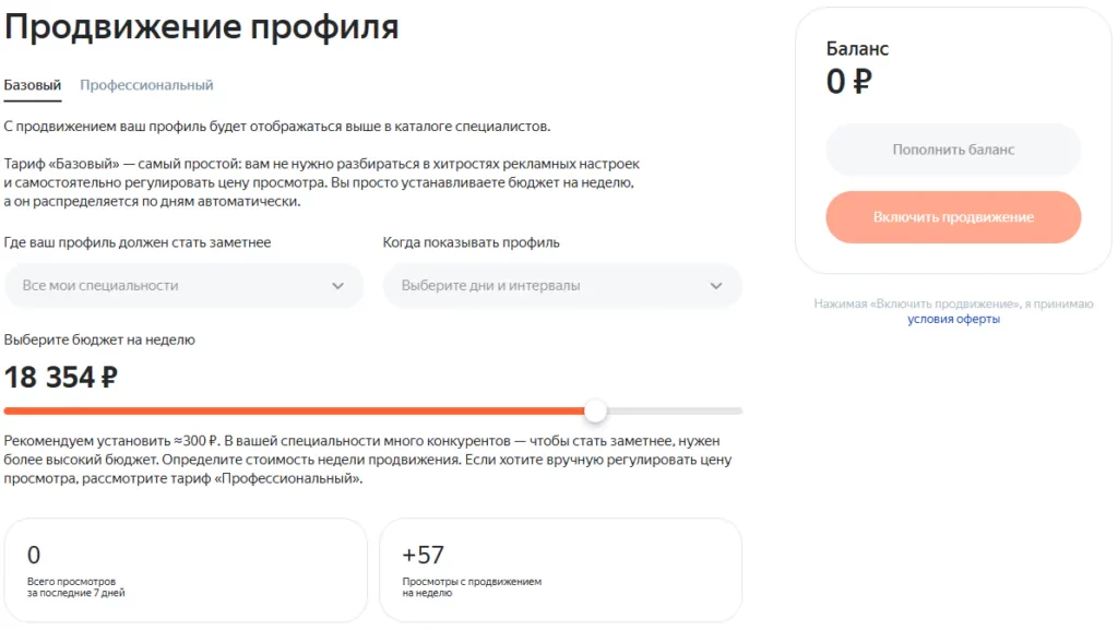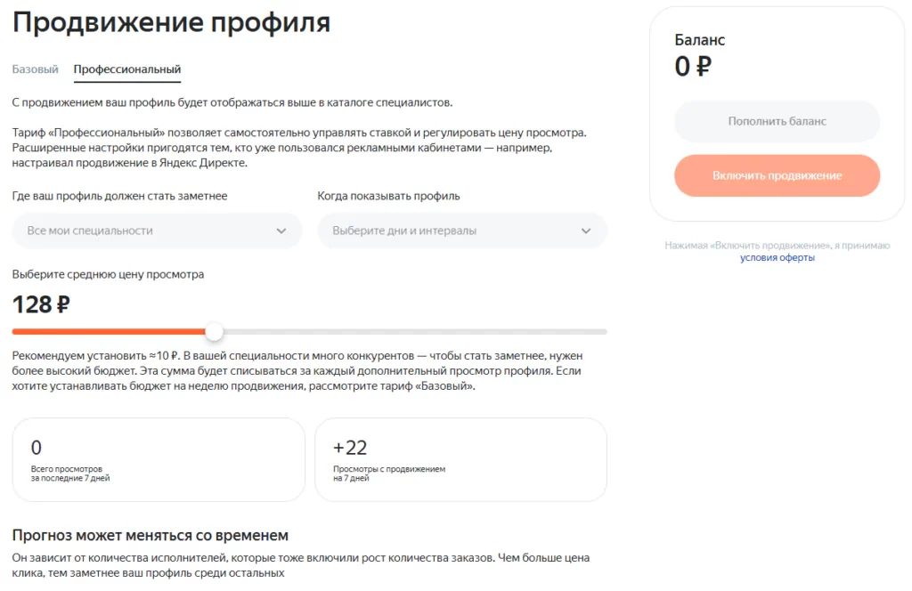 Профессиональный. Цена устанавливается за один просмотр. Просмотр засчитывается только при взаимодействии клиента с карточкой — отправка сообщения, изучение портфолио специалиста, просмотр номера телефона. Если пользователь не взаимодействовал с карточкой, деньги за рекламу не списываются.