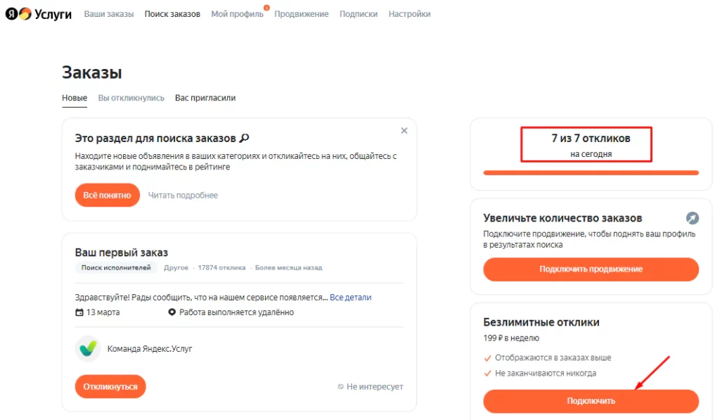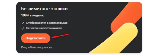 Такого количества откликов может быть недостаточно для привлечения заказов и получения высокого рейтинга. Решить этот вопрос можно, подключив безлимитные отклики за 199 рублей в неделю.