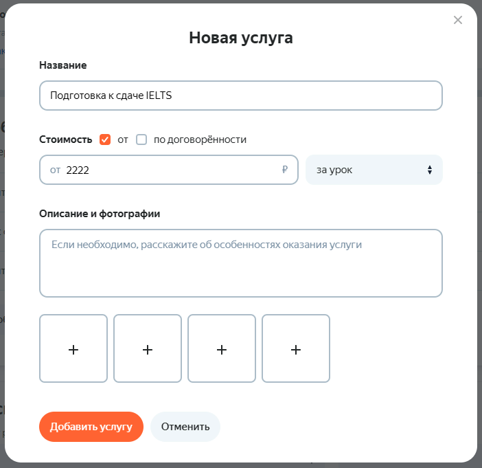 Чтобы добавить услугу, нужно придумать ей название и указать стоимость: фиксированную, стартующую от определенной суммы либо по договоренности. В описании важно указать не только непосредственно описание услуги, но и все нюансы, которые важны при ее оказании. Название должно быть максимально точным: не нужно писать «Занятия по английскому языку», лучше указать более узкий профиль: например, «подготовка к сдаче IELTS». Цену тоже лучше поставить точную либо в описании раскрыть, как она формируется. В зависимости от категории допустимо отмечать, за что именно платит клиент: например, за час или за урок.