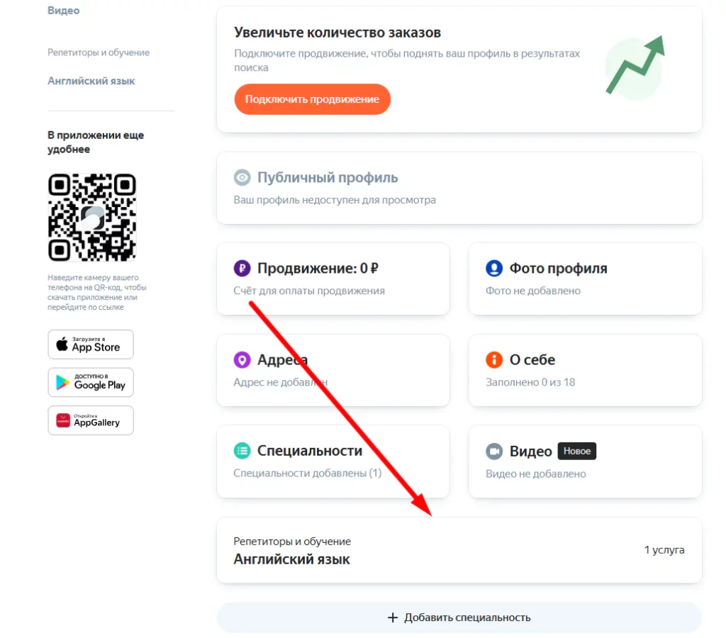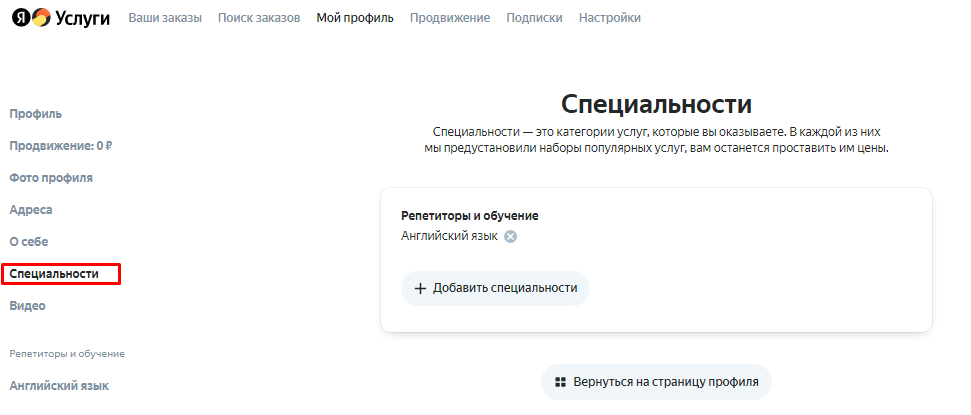 Переходим в раздел «Специальности». Здесь мы во время регистрации уже перечислили все специальности, по которым предоставляем услуги. В примере мы выбрали услугу «Репетиторы и обучение». Поэтому эта информация и отображается в разделе.