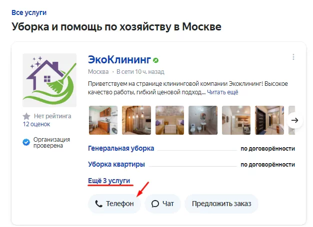 Если нажать на название, вы перейдете в карточку исполнителя: в ней можно дополнительно посмотреть отзывы, справочные данные, адрес и другую важную информацию. Если перешли со смартфона, подрядчику можно сразу позвонить. Доступны и другие способы коммуникации: написать в чат или предложить заказ.