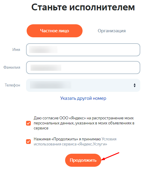 На первом этапе регистрации указываем имя, фамилию и телефон. У зарегистрированных на других сервисах Яндекса пользователей эти данные подставляются автоматически. Принимаем условия использования сервиса и даем согласие на распространение данных, которые указаны в объявлении: