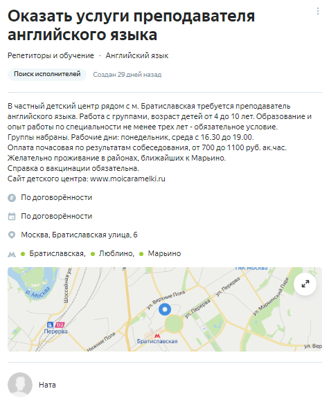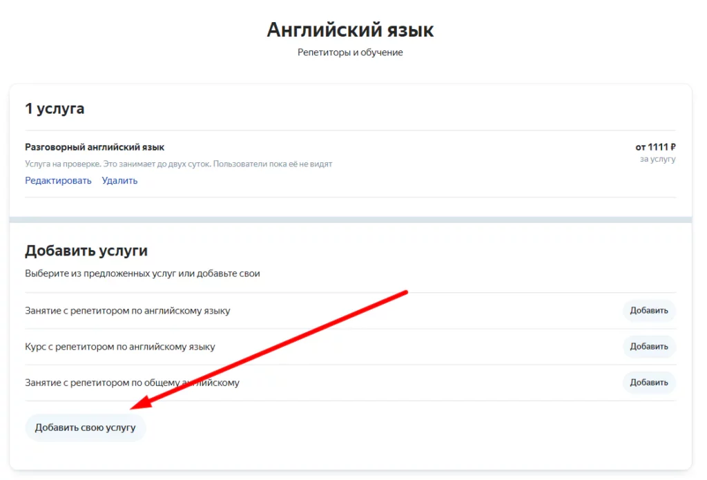 После создания профиля пора публиковать услуги. Именно их карточки будущие клиенты будут находить через поиск и обращаться за обучением английскому языку.