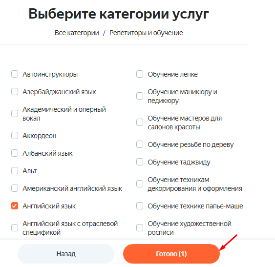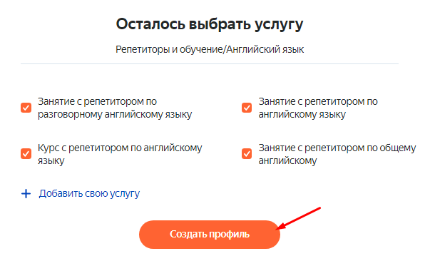 В нашем примере мы предлагаем одну услугу — репетиторство по английскому языку для школьников. Поэтому продвигать будем весь профиль.