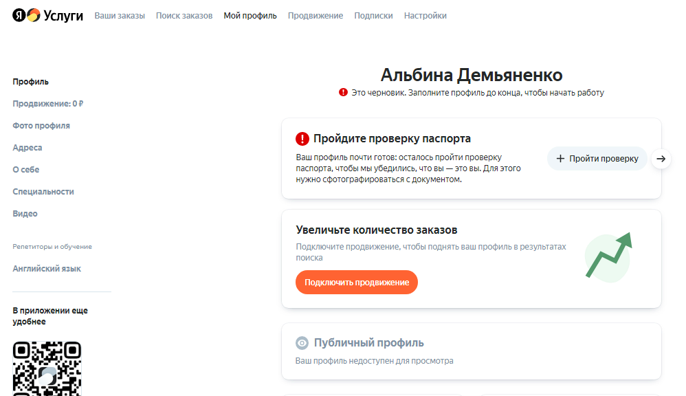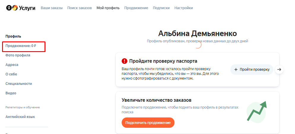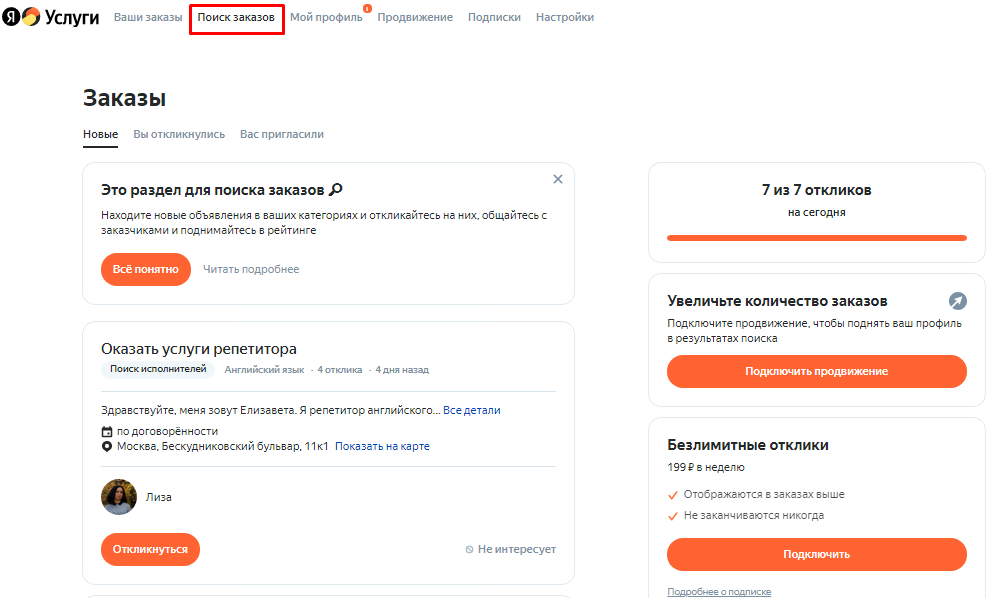 На этом мы закончили регистрацию и заполнение профиля, специализаций и услуг репетитора по английскому языку. Дальше можно ждать, пока заказчики найдут наш профиль и начнут обращаться за услугами. А можно найти заказы самостоятельно и заняться продвижением профиля.