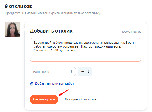 Нас заинтересовало предложение. Поэтому добавляем свой отклик. В нем пишем кратко о своих условиях сотрудничества и кликаем «Откликнуться»: