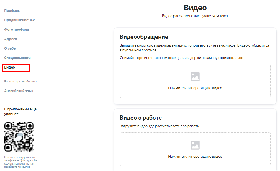 В разделе «О себе» есть возможность прикрепить короткую видеопрезентацию. В ней можно более подробно рассказать о себе как о специалисте и своей работе. Преимущества ролика — клиент получит больше информации об исполнителе и сможет составить первое впечатление за короткое время. Кроме видеопрезентации в сервис можно загрузить видео о работе.