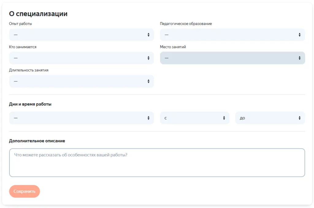 В этом же разделе ниже можно заполнить «Специализацию». В этом блоке стоит рассказать максимально подробно о своем опыте работы, образовании, желаемом месте оказания услуг и так далее. В зависимости от категории добавляются разные поля: у репетитора это, например, длительность занятия и предпочитаемый тип ученика (взрослый, студент, ребенок и так далее). Также желательно указать даты и время работы, чтобы клиентам было проще стыковаться с вами по расписанию.
