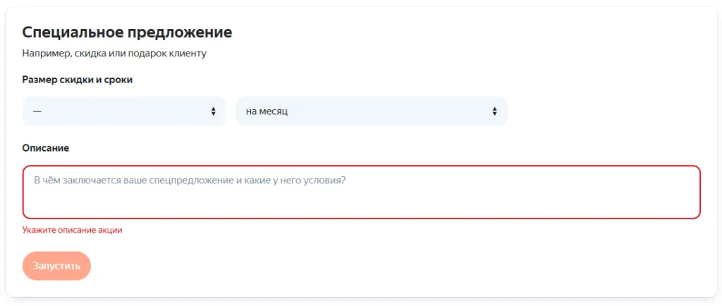 Наконец, можно создавать специальные предложения для клиентов. Небольшая скидка позволит привлечь внимание новых заказчиков или вернуть старых. Можно указывать размер скидки, срок действия предложения и описывать, в чем заключается суть предложения: например, в бесплатном занятии каждому новому клиенту или скидке в 10% при покупке курса обучения.