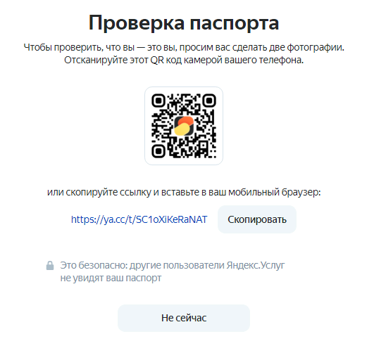 Далее пройдем проверку паспорта. Для этого сделаем две фотографии и отсканируем камерой телефона предоставленный сервисом QR-код.