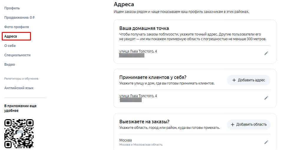Адрес места проживания или оказания услуг. Эта информация позволит исполнителю получать заказы от людей, которые находятся неподалеку. На карте местоположение отображается с погрешностью в 300 и более метров. Поэтому остальные пользователи увидят приблизительный адрес.