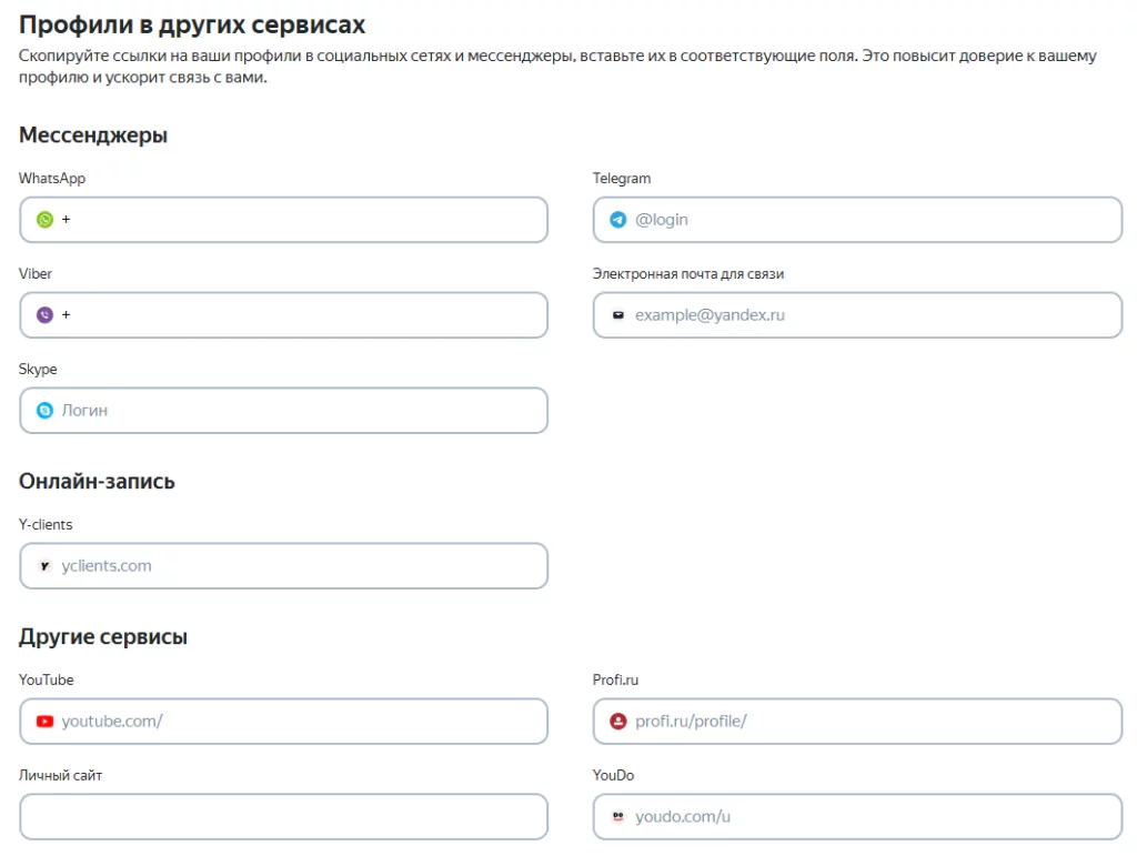 Указываем профили в других социальных сетях и мессенджерах. Чем больше каналов связи предлагает исполнитель клиентам, тем лучше — это повышает доверие к профилю и упрощает коммуникацию.