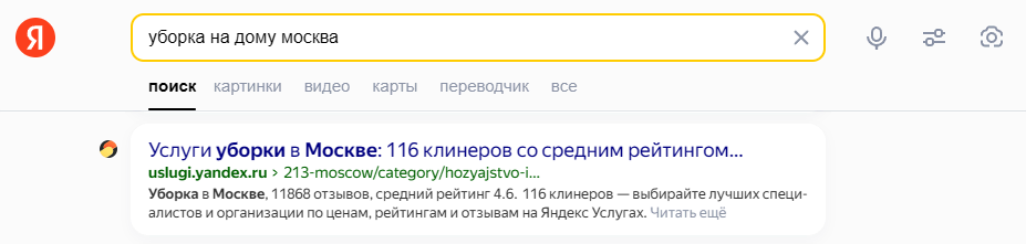 Заказчик может найти подрядчика прямо на поиске Яндекса. Для этого нужно просто ввести запрос, и на первых позициях выдачи обязательно окажется предложение из Яндекс Услуг: