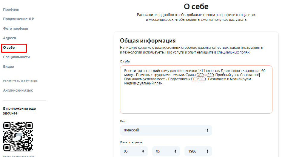Для привлечения клиентов важно максимально заполнить все разделы профиля.