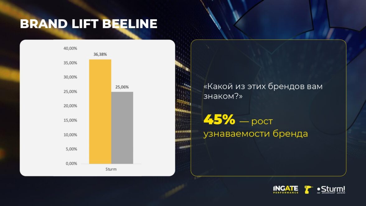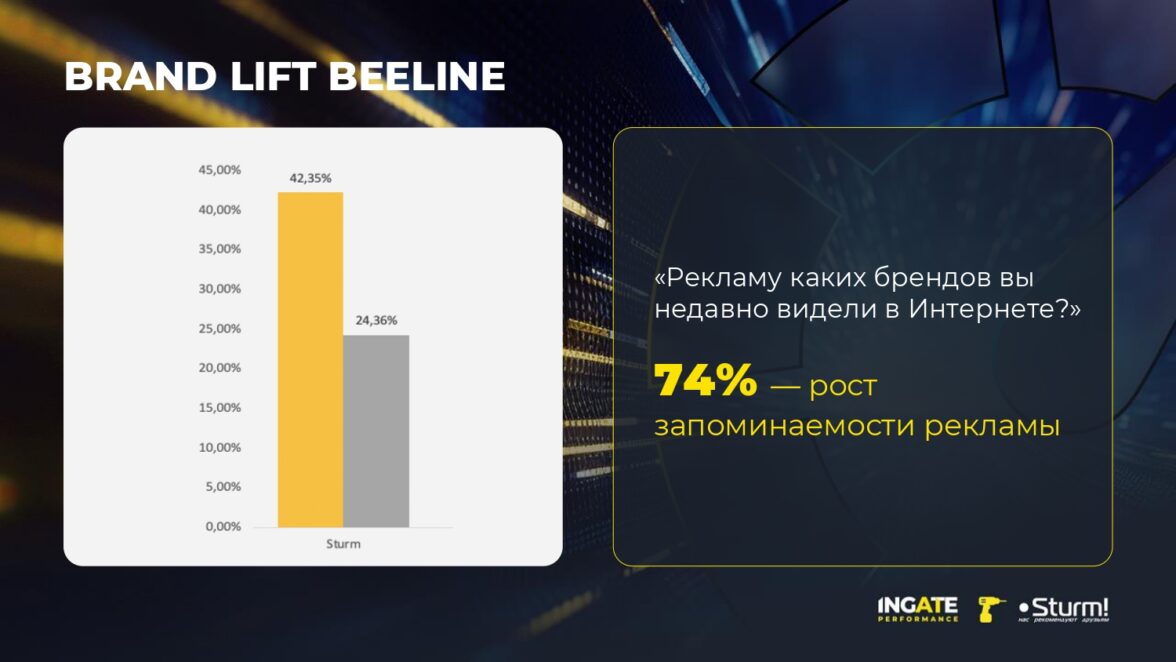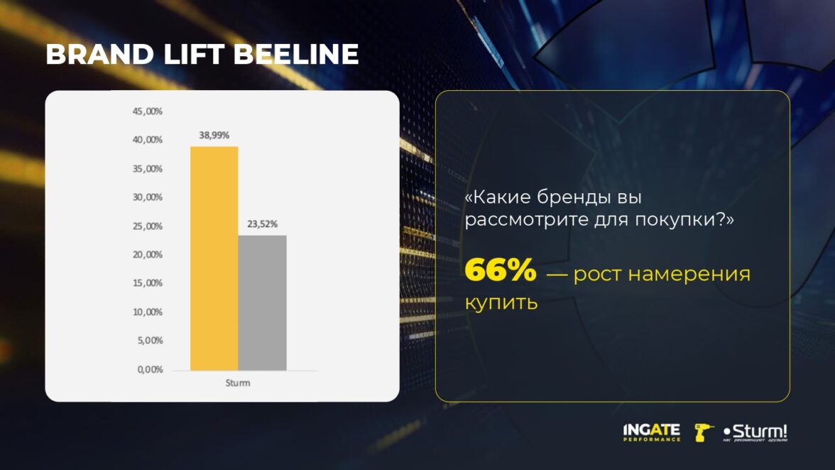 В результате кампании узнаваемость бренда «Sturm!» выросла на 45%, а намерение к покупке — на 66%. Также заметен рост прямого трафика на сайт в 2,5 раза в неделю после запуска рекламы.