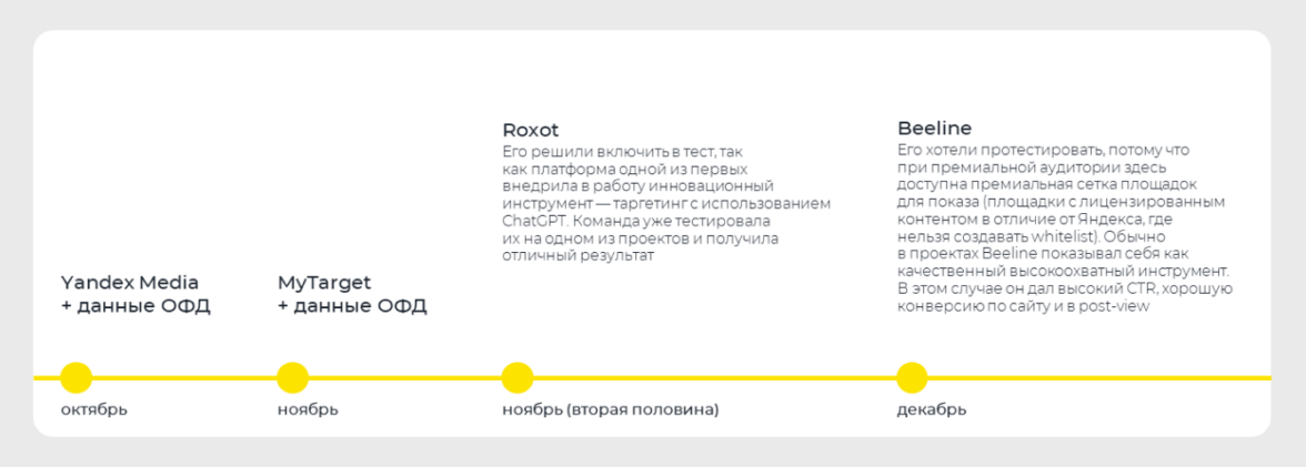 Для того, чтобы замер результатов с помощью Brand Lift (которые делали в «Яндекс» и Beeline) был корректным, все каналы запускали последовательно: