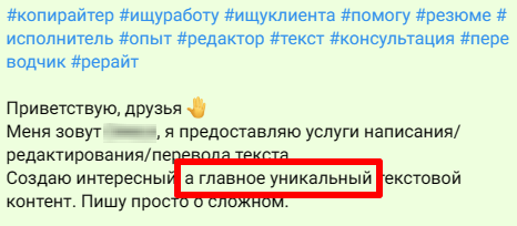 Фраза «Пишу уникальные тексты» выдает вчерашнего биржевика, который до сих пор считает уникальность главным критерием оценки текста. Нет, главное — польза для клиента и то, как реально работал текст — вышел в топ, привел трафик и новых лидов. Не то, что нужно сразу отказываться от сотрудничества, но лучше лишний раз перепроверить: попросить сделать тестовое, изучить портфолио.