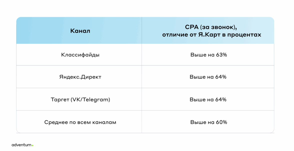 По соотношению затрат и эффективности Яндекс Карты оказались наиболее выгодным каналом, особенно с учетом неаукционного размещения и относительно небольшого бюджета.