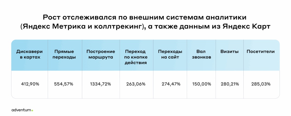 Рост отслеживался по внешним системам аналитики (Яндекс Метрика и коллтрекинг), а также данным из Яндекс Карт