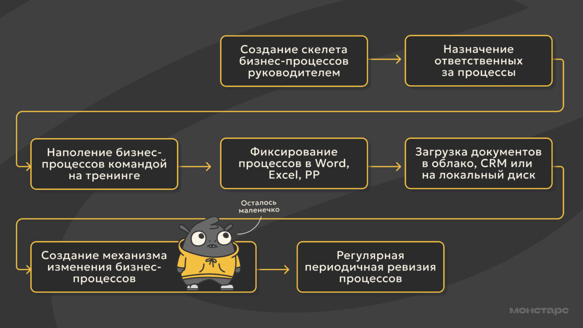 То есть сами по себе бизнес-процессы не приведут новых клиентов и не создадут гениальные кампании. Но зато обезопасят от того, чтобы глупо потерять клиента или из-за несогласованности в отделах опоздать с предложением на тендер и не получить жирный контракт.