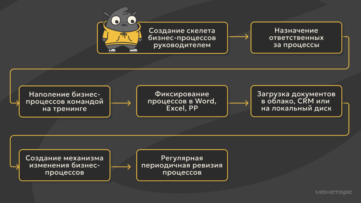 Всё начинается с головы, поэтому первый шаг за руководством. Чтобы запустить процесс, менеджменту нужно хотя бы в общих чертах прописать свое видение процессов — сформировать скелет. Также на первом этапе следует выделить три группы сотрудников, которые будут участвовать в формировании бизнес-процессов.