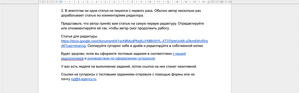 Так выглядело второе задание. Важно задать контекст, чтобы редактору было понятно, из чего исходить при редактуре
