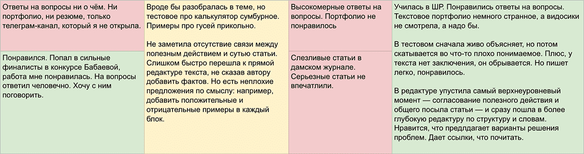 Хорошо выполненные тестовые задания были важны, но не критичны, потому что не было единственно верного способа их сделать. Я смотрела больше на подход и на логику кандидатов. Например, в задании на редактуру было сказано «автор принёс вам первый вариант статьи на редактуру». Соответственно, я ожидаю, что редактор начнёт редачить с полезного действия, структуры и логики текста, а не будет на чистовую переписывать текст. Как он будет редачить — другой вопрос: кратко указывать, что плохо, или подробно объяснять ошибки, давать ссылки на какие-то статьи, писать грубо или более деликатно. Я обращала внимание на все эти детали.
