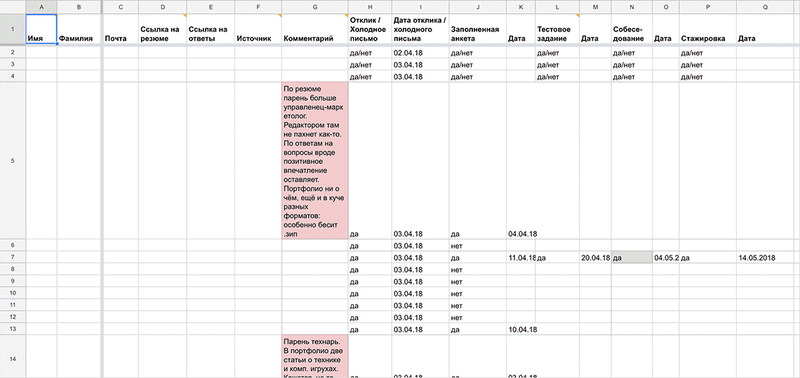 Последний шаг подготовки — завести таблицу со списком всех-всех-всех кандидатов. Она помогает быстро соображать, кто есть кто и на каком этапе найма находится.