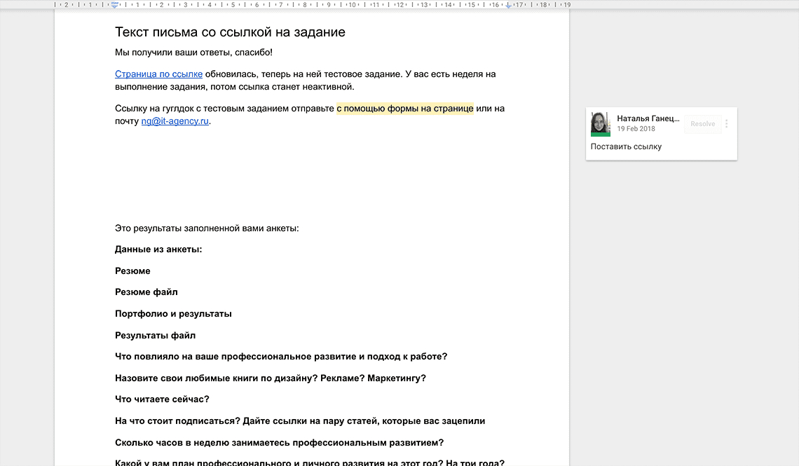 Во всём этом процессе я не упомянула одну штуку — страницу с вопросами, на которые кандидат должен ответить после подачи заявки. Это потому что всё тут было готово до меня. Если вкратце, после подачи заявки кандидат получает ссылку на стандартный список вопросов, на которые он должен ответить в течение недели. Вот этот список: • Резюме. • Портфолио и результаты. • Что повлияло на ваше профессиональное развитие и подход к работе. • Назовите свои любимые книги по дизайну? Рекламе? Маркетингу? • Что читаете сейчас? • На что стоит подписаться? Дайте ссылки на пару статей, которые вас зацепили. • Сколько часов в неделю занимаетесь профессиональным развитием? • Какой у вас план профессионального и личного развития на этот год? На три года? • Расскажите что-нибудь про себя. Они дают первое представление о том, кто перед тобой. Причём роль играют и сами ответы, и то, как они написаны. Даже через текст чувствуется настрой кандидата: напряжённый или расслабленный, доброжелательный или агрессивный.