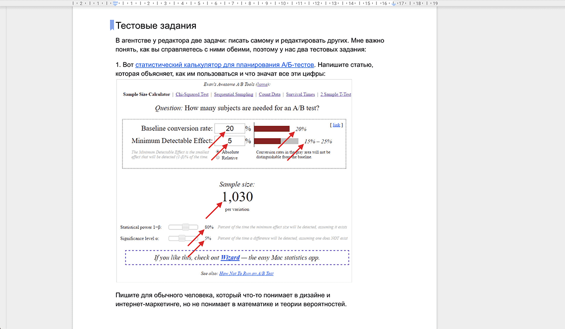 Это задание придумали до меня: я сама его делала, когда подавала заявку на позицию редактора в агентстве. Смысл в том, чтобы разобраться, как работает статистический калькулятор расчёта выборки для проведения А/В-тестов, и написать об этом статью.